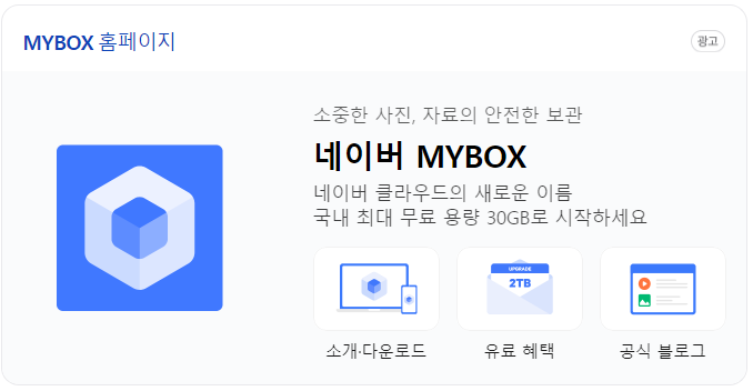 네이버 마이박스는 우리나라에서 최대 많은 30GB의 무료 데이터 저장공간을 제공해주는 네이버의 클라우드 서비스인데요 동영상,사진,음악,문서파일등 모든 데이터파일들을 클라우드에 저장할 수 있습니다.
