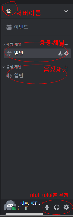 서버이름, 채팅채널, 음성채널과 마이크, 이어폰,사용자 설정이 보이시죠?