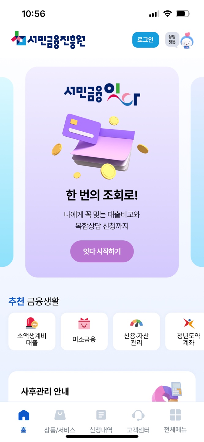 민간,정책서민금융상품으로 조회부터 대출까지 한번에 지원하는 서민금융 잇다 어플입니다.