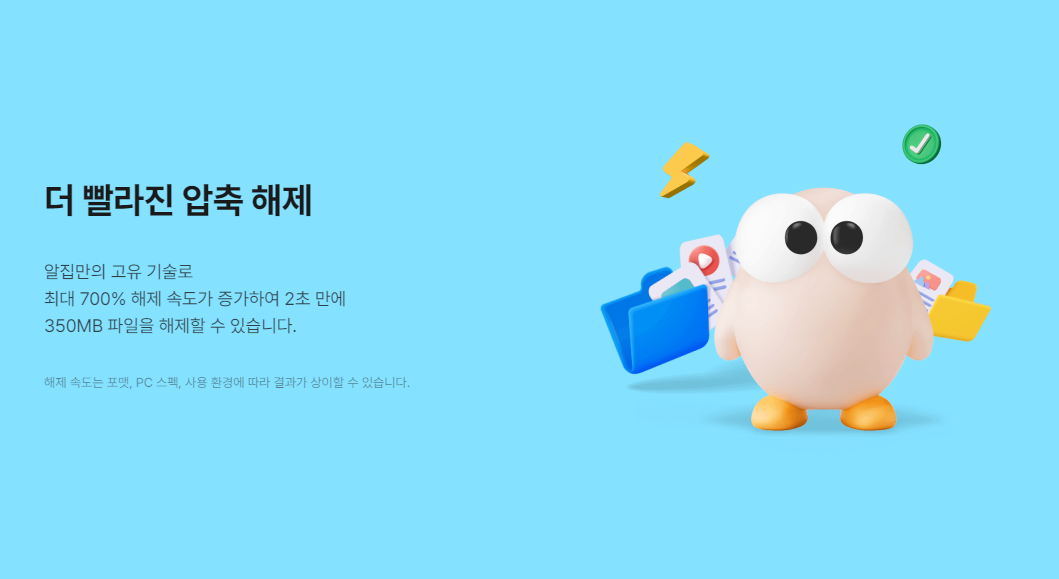 더 빨라진 압축 해제 알집만의 고유 기술로 최대 700% 해제 속도가 증가하여 2초 만에 350MB 파일을 해제할 수 있습니다. 해제 속도는 포맷, PC 스펙, 사용 환경에 따라 결과가 상이할 수 있습니다.