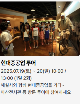 - 현대중공업 투어: 조선 산업의 심장, 현대중공업을 해설사와 함께 견학 (7월 19~20일, 1일 2회, 사전 접수 필수)