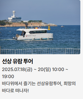 - 선상 유람 투어: 요트와 전기보트로 바다를 즐기는 체험 (7월 18~20일, 10:00~19:00, 현장 유료 접수)