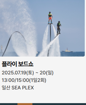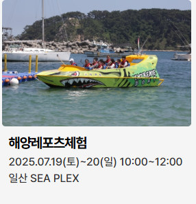 - 7월 19일(토): 일산 워터밤, 나이트런 일산(3km 야간 러닝), EDM 파티, 기발한 배 콘테스트(레이싱), 드론 축구, 해양레포츠 체험, 현대중공업 및 동구 관광 투어, 선상 유람투어, 썸머빌리지